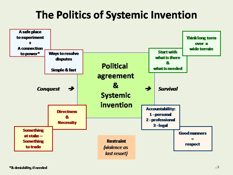 One of the most important foundation blocks in systemic change is the capacity to agree. This might be won by violence, by votes, by negotiation or by the force of powerful, respected people. Agreement is especially difficult in a period of systemic invention because no one has a monopoly on right answers. Instead, competing interests, values, world views and experience seek to define what is happening, how it might be managed, and who gets the benefits of any change.